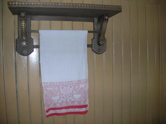 ... на резной вешалке такое же вышитое полотенце..