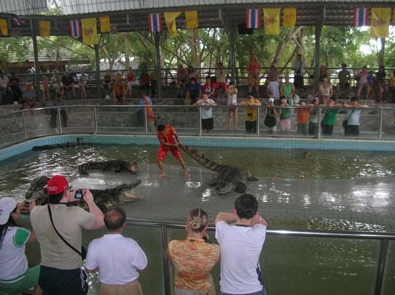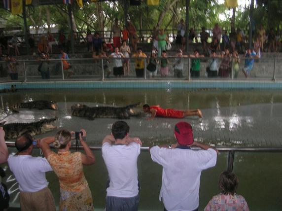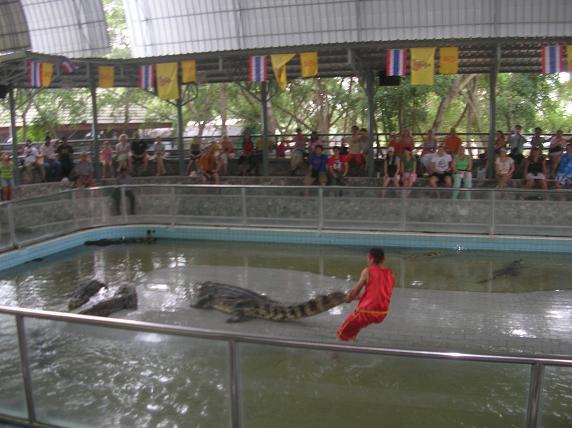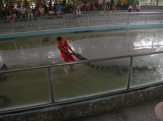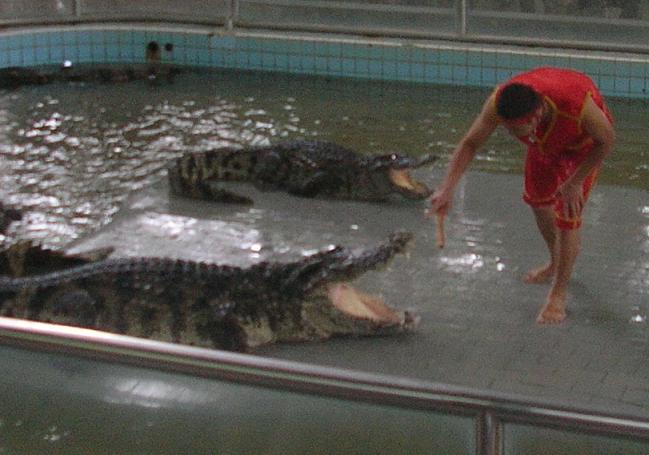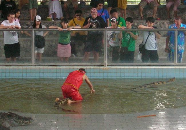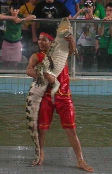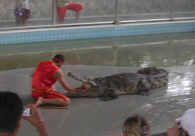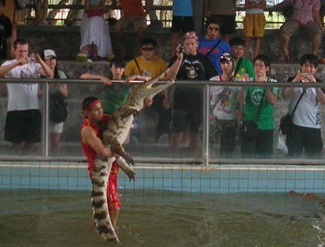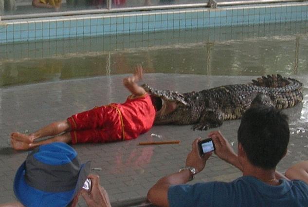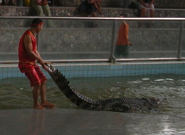 приступает к действу. Начинает таскать крокодилов за хвосты…