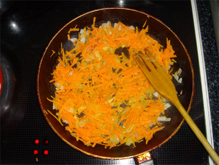 морковку на крупной тёрке, обжарить на растительном масле, потом