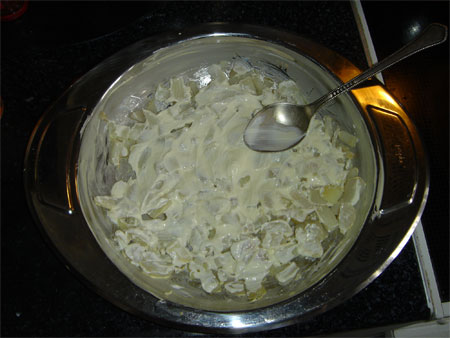 луком и морковкой. снова пара ложек сметаны, последний слой -