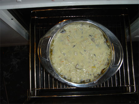 добавить туда отварные грибы, посолить, форму смазать маслом,